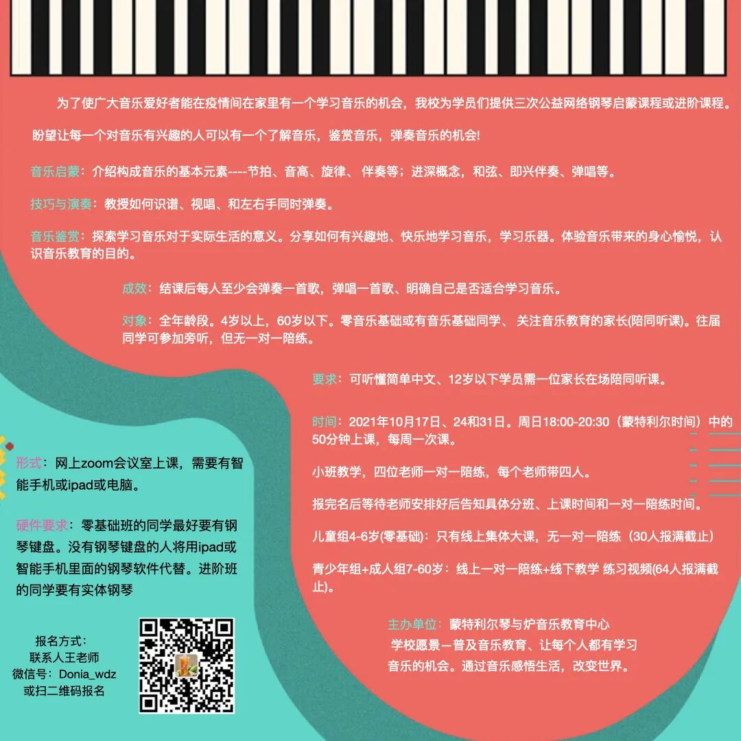 我校将在10月中下旬开展三次网络公益钢琴课程。盼望疫情期间任何人都能在家学习音乐。这是面向全北美,全年龄段的无门槛课程,欢迎报名。报名微信:Donia_wdz 或扫图片中的二维码。