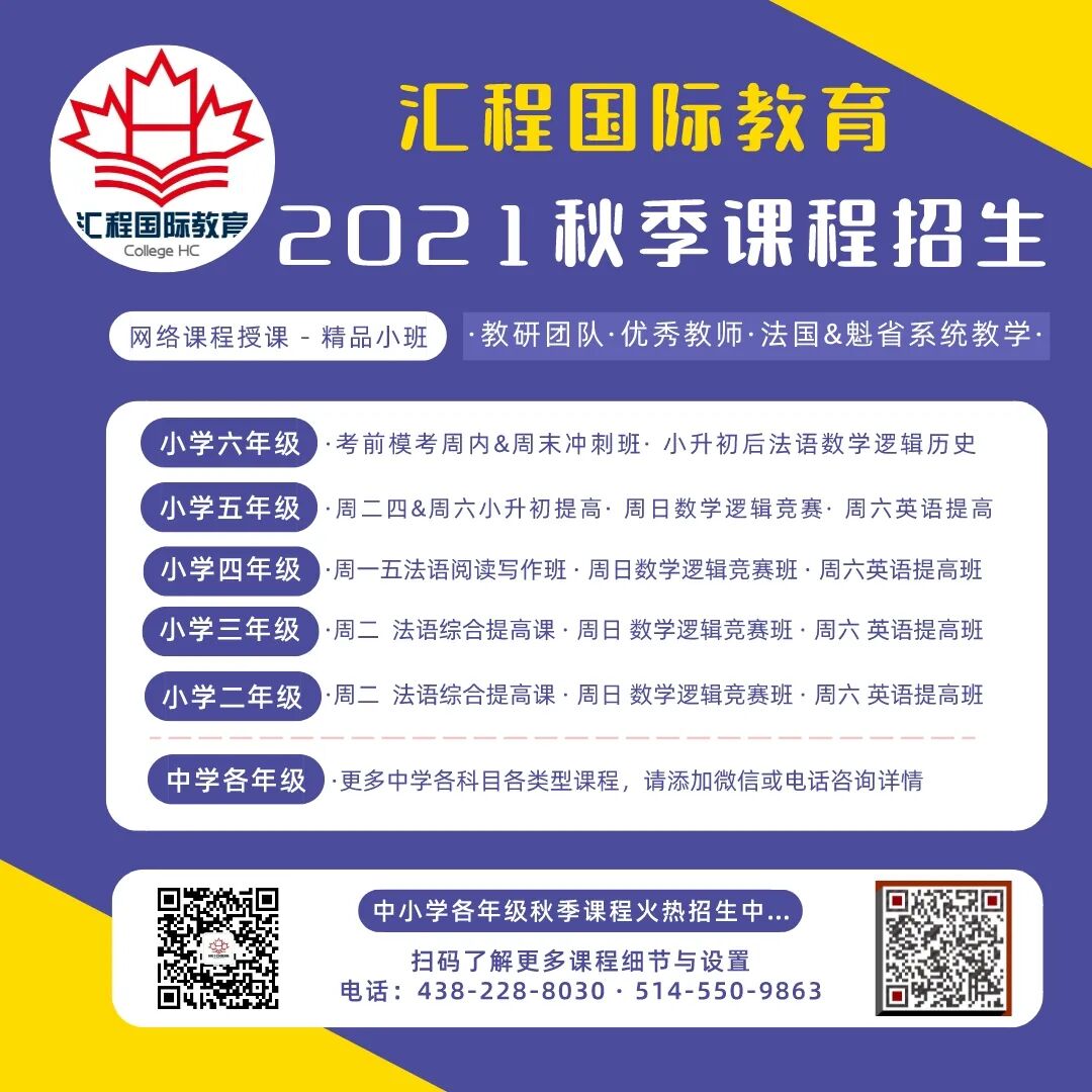 汇程教育位于加拿大蒙特利尔,致力于中小学法语,英语,数学逻辑等学科和