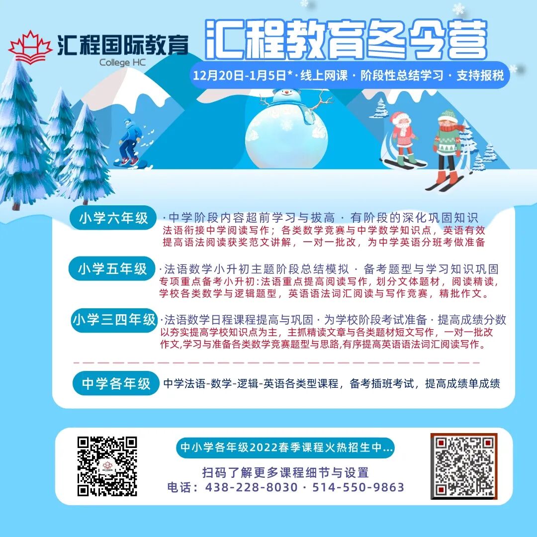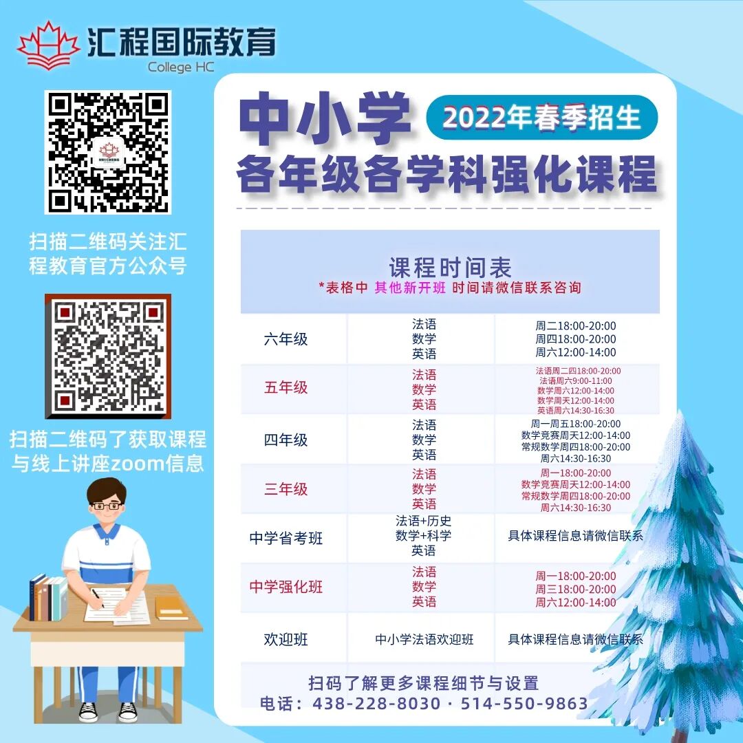 汇程教育位于加拿大蒙特利尔,致力于中小学法语,英语,数学逻辑等学科和 PEQ 法语培训,学签,工签,旅游签等办理。我们深谙魁省教育系统和教学大纲,小升初考试和私校插班考,并与多所名校,教委保持密切合作。
