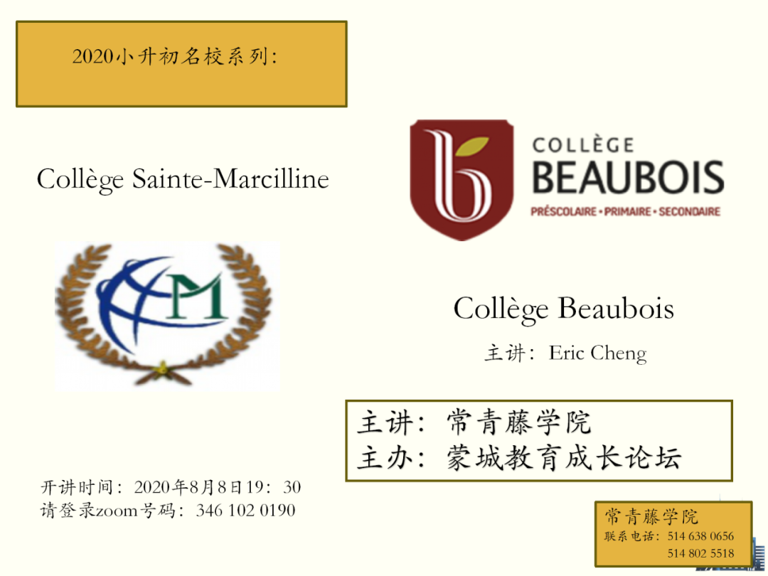 2020年小升初大型系列名校公益讲座第六场于8月8日晚7点半开讲,蒙城教育成长论坛主办,常青藤特邀Eric Cheng主讲。Eric从学前班到中五一直在Beaubois就读,现被Marianoplis Science 录取。本篇文字和图片均由常青藤学院提供。未经作者允许,严禁转载。