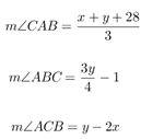 Considérons le triangle isocèle ABC illustré ci-dessus. Les mesures des angles intérieurs de ce triangle sont exprimées par des polynômes. Quelle est, en degré, la mesure de l'angle CAB ?